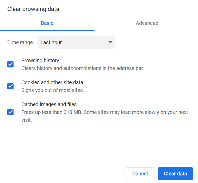 7. The preselection is fine, i.e. the time range should cover the last hour, and it is okay that the browsing history, cookies and other site data, as well as cashes images and files are checked. Go ahead, click clear data, and try logging into Atlas again.