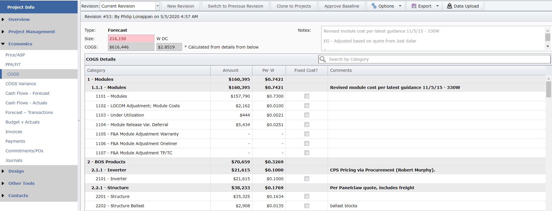 To change the amount, per Watt, or comments of a line item, type directly into the respective cell. If one of your COGS amounts is a fixed amount, which does not change based on the size of a project (such as a fee), you should use the Fixed Cost? checkbox. This way you assure that whenever the size of the project is updated, this (fixed) amount is not auto-recalculated based on the per Watt rate. Check this box after entering the amount or per watt.